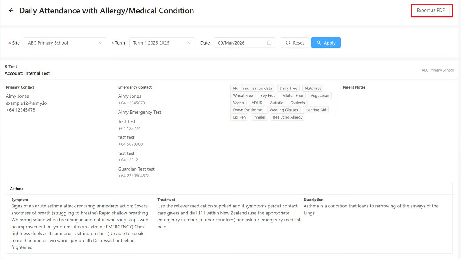 The Daily Attendance with Allergy/Medical Condition Report displays allergy and medical conditions of all attendees linked to a selected site, term and date. This report allows users to quickly identify attendees with special conditions that they need to be mindful of on a particular day.