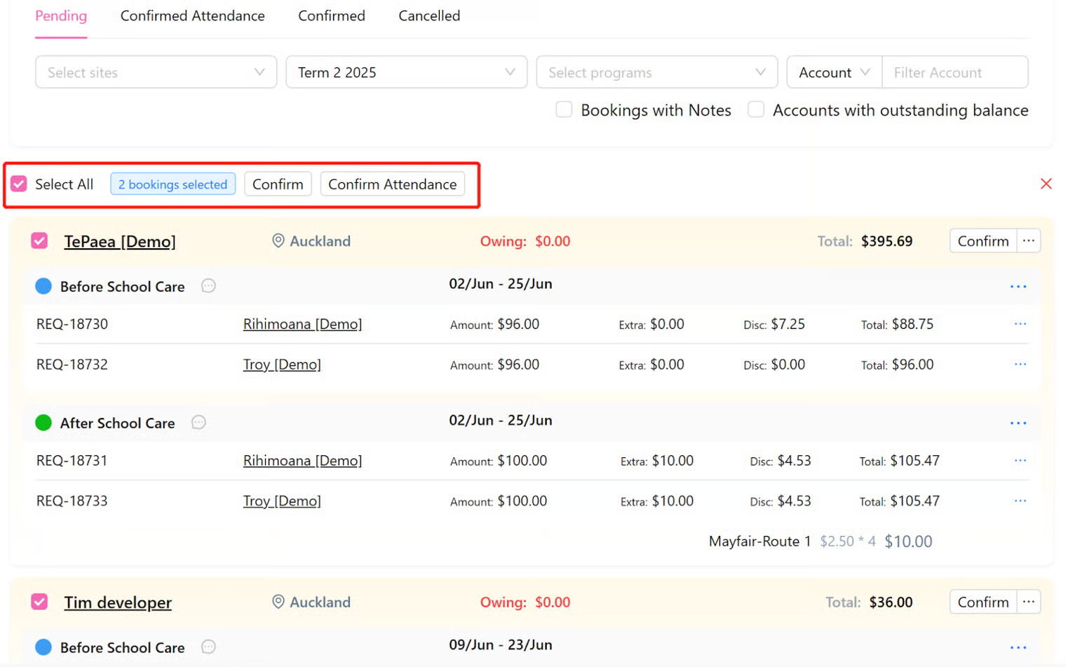 When there are multiple pending bookings to be confirmed together, tick the checkbox next to ‘Select All’ to batch confirm them or confirm attendance only. The number of bookings selected will display, and users are able to deselect some of them by removing the checkbox of each booking individually.