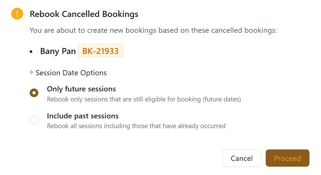 To rebook a cancelled booking, click on the ‘Rebook’ button. You will then be asked whether to include the past sessions or not.