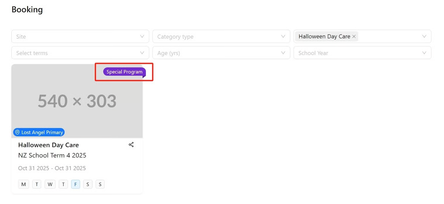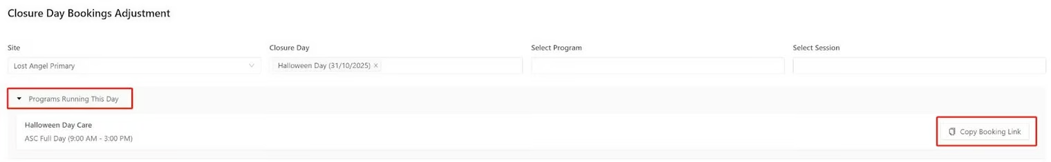 If you are running alternative programs on the day, the final step is to let your customers know so they can make new bookings if care is needed. You can find the booking links conveniently located on the adjustment page by clicking ‘Programs running this day’.