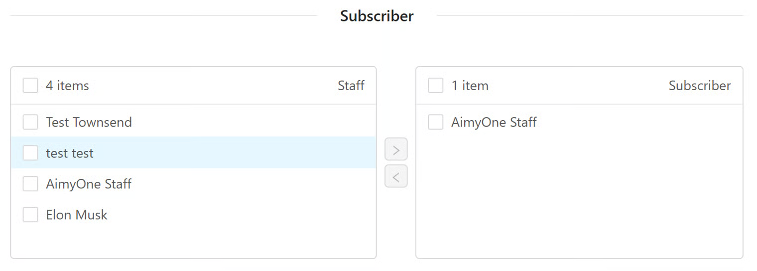 To subscribe to receive notifications when a new event occurs, click into that particular notification, then select the staff members who wish to subscribe using the right arrow to move them over to the subscribed list. Email notifications will be sent to their login emails.