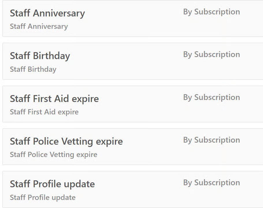 - Staff Police Vetting Expiry: Get notified 1 month, 1 week before the event, on the same day as the event, and 1 month after the event.