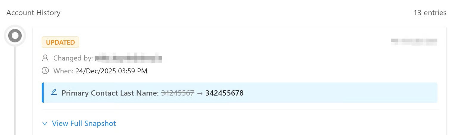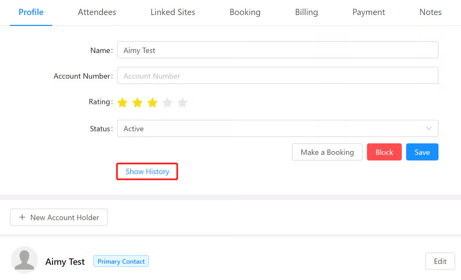Admin users are able to view logs for changes made to an account by going to the account profile, then click ‘Show History’ as shown below.