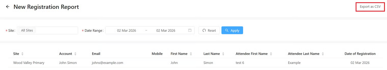 The Attendee Report displays a list of attendees linked to a selected site. This report includes information included in attendee profiles, such as name, gender, age etc. The report can be exported to a CSV file by clicking the 'Export' button ...